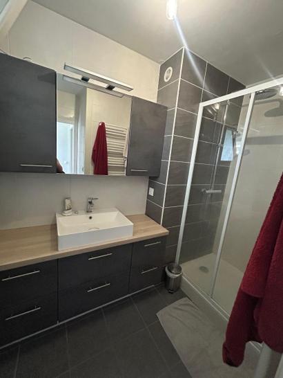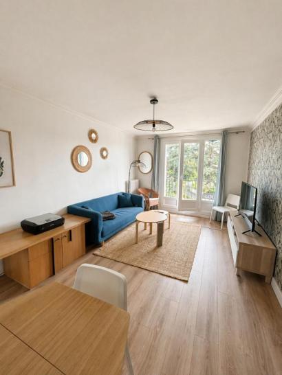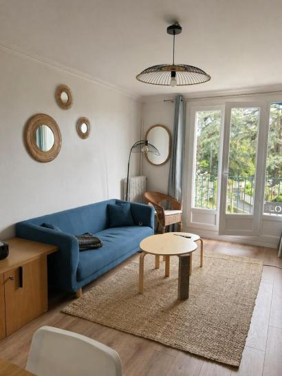 Les parties communes de l'appartement s'organisent comme suit : un séjour équipé d'un canapé, tables basses, une meuble télé avec une télévision une table à manger avec 4 chaises, un bureau avec imprimante et des éléments décoratifs. Vous y trouverez également une belle cuisine aménagée et équipée ( four, plaque, hotte, micro-onde, réfrigérateur, cafetière, grille-pain), un cellier, une salle d'eau, des WC séparés et un balcon.
